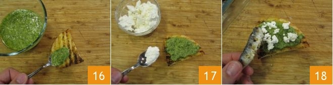 En este punto todo está listo para proceder con la composición de las bruschetas: sobre las rebanadas de pan verted un poco de pesto 16, añadid unas migas de ricotta 17 y luego un par de sardinas 18.