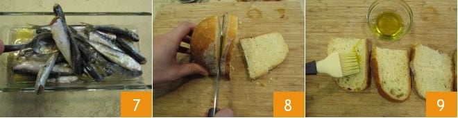dad una buena mezcla y reservad 7. Ahora ocupáos del pan: obtened 4 rebanadas de aproximadamente 2 cm de grosor 8. Luego pincelad con un poco de aceite 9