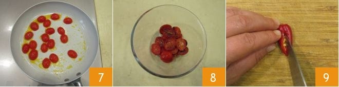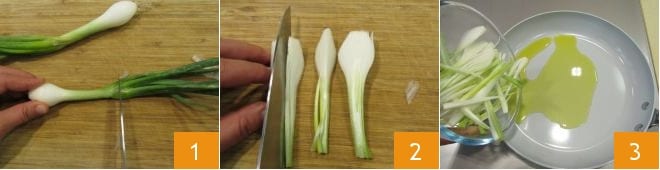 asádlos en la misma sartén donde habéis salteado las cebolletas 7, luego ponedlos en un bol 8. Ahora ocupáos del chile fresco: cortadlo por la mitad 9