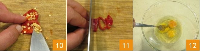 extraéd las semillas 10 y cortadlo en rodajas finas 11, reservad también esto y dedicáos a los huevos: en un bol batid los huevos enteros con sal y pimienta 12