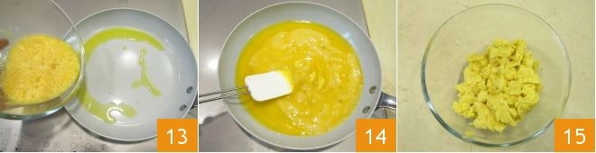 calentad un poco de aceite en la sartén y verted los huevos batidos 13, cocinad a fuego moderado durante un par de minutos y mezclad para revolverlos 14. Cuando comiencen a cuajar, podéis apagar el fuego: el calor de la sartén será suficiente para continuar la cocción. Una vez que estén listos, no deben estar líquidos pero tampoco tener una consistencia demasiado cocida: deben tener un color homogéneo, una consistencia suave y ligeramente granulosa. Luego, transferidlos a un bol 15.