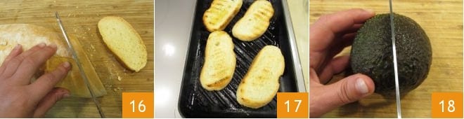 Cortad el pan 16 para obtener rebanadas de 2 cm de grosor, untad una plancha con un poco de aceite y, cuando esté bien caliente, tostád las rebanadas de pan durante 2 minutos por cada lado. Para terminar, ocupáos del aguacate: divididlo por la mitad 18