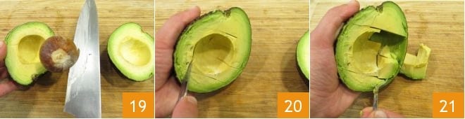 Extrae el hueso con un cuchillo 19, con un cuchillo pequeño marcad la pulpa creando incisiones horizontales y verticales 20, esto os permitirá extraer la pulpa con más facilidad utilizando una cuchara 21.