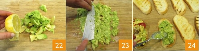 Recoged la pulpa en una tabla de cortar, aderezadla con el jugo de limón para evitar que se oscurezca 22. Pícad la pulpa de aguacate finamente con un cuchillo, tratando de hacer una crema aplastando el picado de aguacate aplanando la hoja sobre la tabla de cortar, para obtener un puré 23. Todo está listo para montar la bruschetta brunch: tomad una rebanada de pan tostado, untad encima el puré de aguacate 24