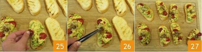 Distribuid también el huevo revuelto, los tomatitos asados 25 y las cebolletas estofadas 26, terminad aromatizando con las rodajas de chile. Vuestras bruschettas brunch están listas para ser servidas 27