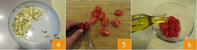 salad, pimentad y estofadlas durante 6-7 minutos 4 y reservadlas. Lavád los tomatitos (necesitaréis 8), divididlos por la mitad 5, aderezadlos con aceite 6, sal y pimienta