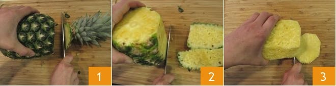 Para preparar los buñuelos de piña, primero limpia la piña: quita la parte superior con las hojas 1, elimina la piel 2 y córtala en rodajas de 1 cm de grosor 3,