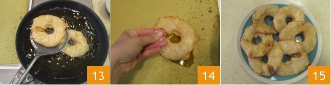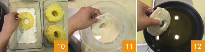 Llena una cacerola con abundante aceite de semillas y llévalo a una temperatura de 170° usando un termómetro para controlarlo. Pasa las rodajas de piña cuidadosamente por la harina 10, luego sumérgelas en la masa 11, escurre el exceso de masa y sumérgelas delicadamente en el aceite caliente 12. Fríe pocos trozos a la vez para evitar que la temperatura del aceite baje.