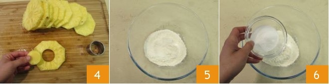 luego usa un cortador de aproximadamente 4 cm de diámetro para quitar el núcleo de cada rodaja 4; alternativamente, puedes usar el utensilio adecuado. Pasa a preparar la masa: vierte la harina en un bol 5, añade el azúcar 6