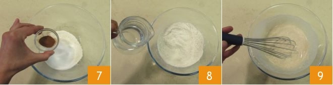 y la canela 7, luego añade el agua 8 y mezcla con una batidora hasta obtener una mezcla suave y homogénea 9.