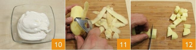 transfiérela a un cuenco pequeño 10. Ocúpate de las patatas: pélalas 11 y córtalas en pequeños cubos de 1 cm 12, para que no se oscurezcan colócalas en un bol con agua fría,