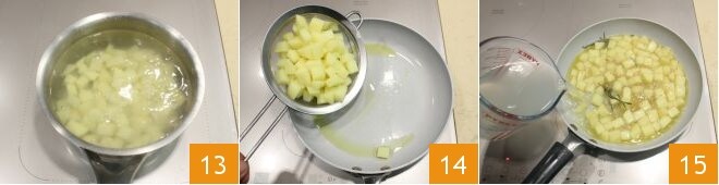 luego sumérgelas en agua hirviendo con sal 13 y cuécelas durante 4-5 minutos. Escurre las patatas reservando el agua de cocción y viértelas directamente en una sartén donde has calentado el aceite 14, añade el romero, sal, pimienta, dora ligeramente las patatas y añade 100 gr de agua de cocción 15.