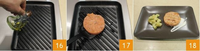 Continúa la cocción a fuego alto, hasta que el agua se haya evaporado y las patatas estén cocidas. Mantenlas calientes y cocina las hamburguesas: engrasa una plancha de hierro fundido 16 y caliéntala, cuando esté bien caliente coloca las hamburguesas 17 y cocínalas dos minutos por cada lado. Al finalizar la cocción, sirve las hamburguesas bien calientes con las patatas salteadas y acompaña el plato con la mayonesa sin huevo 18.