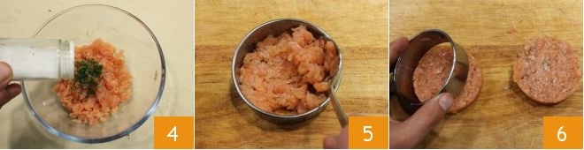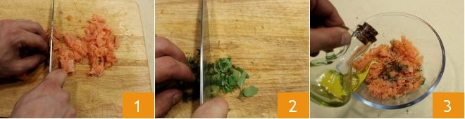Para realizar la hamburguesa de salmón con mayonesa sin huevo y patatas salteadas, corta en cubos el filete de salmón 1, luego pícalo finamente con el cuchillo para desmenuzarlo 2. También pica finamente las hierbas aromáticas: la mejorana, el eneldo y el tomillo 3.