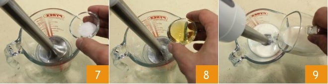 Mientras tanto, prepara la mayonesa sin huevo: en una jarra, vierte el aceite, la sal 7 el vinagre de manzana 8 y comienza a batir con la batidora de mano. Añade poco a poco la leche de soja 9 y continúa emulsionando hasta obtener una crema densa y espumosa,