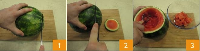 Para preparar la caipiroska de sandía, comienza eliminando los dos extremos de la fruta. Ten cuidado porque uno de los dos será la base del contenedor, así que haz un corte muy estrecho y preciso 1. Luego elimina también la otra parte, haz un corte más grande y conserva el extremo 2. Con la ayuda de una cuchara, vacía el interior de la sandía recogiendo todos los trozos de pulpa en un recipiente 3.