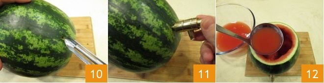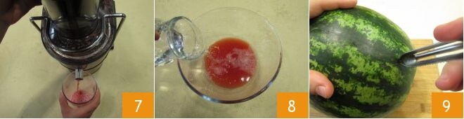 y enciende la máquina colocando un recipiente debajo para recoger el zumo extraído 7, pesa la mezcla y añade una cantidad igual de vodka 8. Toma nuevamente la sandía y haz una incisión en un punto bien preciso con un utensilio puntiagudo, como un vaciador o una cuchilla 9.