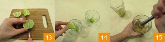 Prepara la base machacada del cóctel, corta las limas por la mitad. Usa medio lima para cada vaso que prepares: corta las mitades en 2 trozos 13 y viértelos dentro de los vasos 14. Añade el azúcar moreno y machácalo con la ayuda de un mortero 15.