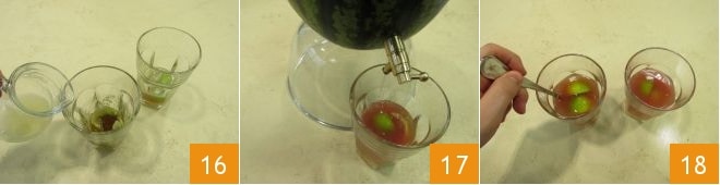 Vierte el jugo de limón en el vaso 16 y coloca el vaso debajo de la sandía con zumo de sandía y vodka y deja que fluya dentro del vaso 17 y luego mezcla todo 18.