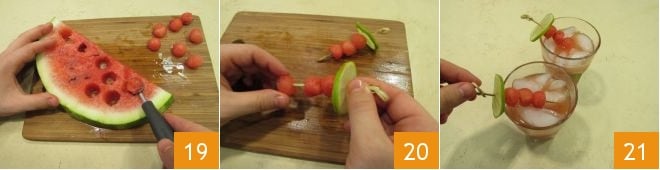 Para decorar los vasos, vacía el interior del extremo que eliminaste inicialmente y saca 3 pequeñas esferas para cada vaso 19, y en un palo de madera coloca primero una rodaja de lima y luego las esferas de sandía 20. Por último, decora tu caipiroska de sandía con 6 cubitos de hielo para cada vaso y la decoración con lima y esferas de sandía 21!