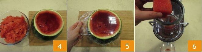 Vacía cuidadosamente el interior eliminando todas las semillas y posibles filamentos de pulpa; si lo prefieres, ayúdate con un paño ligeramente húmedo, y alisa las superficies en el interior 4, luego cubre el recipiente con film transparente y refrigera 5. En la centrifugadora, vierte la pulpa vaciada de la sandía 6