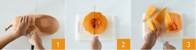Para preparar la calabaza en sartén con cebollas y aceitunas, comienza cortando la calabaza por la mitad 1 y luego otra vez por la mitad 2. Pélala 3 y elimina las semillas y los filamentos de su interior.