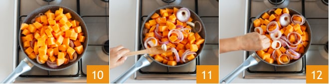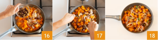 Añade los cubos de calabaza y deja cocinar a fuego alto durante unos minutos 10, luego elimina el diente de ajo. Salpimienta 12.