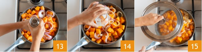 Pimienta 13 y mezcla con delicadeza. Cocina durante 6-7 minutos. Vierte el agua caliente 14, cubre con una tapa 15 y continúa la cocción durante otros 15 minutos aproximadamente.