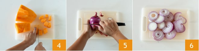 En este punto córtala en rodajas y luego en cubos no demasiado pequeños 4. Es preferible hacer cubos del mismo tamaño para no variar demasiado la consistencia durante la cocción. En total obtendrás 700 g. Limpia la cebolla 5 y córtala en rodajas 6.