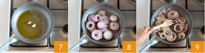 En una cazuela vierte un poco de aceite y dos dientes de ajo 7. Luego añade la cebolla 8 y mezcla delicadamente, intentando separar los aros 9. Deja cocinar unos 5 minutos, hasta que la cebolla esté pochada.