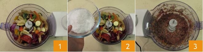 Para preparar el caldo vegetal tomad todos los restos de vuestras verduras 1. Podéis utilizar cualquier tipo y cualquier parte comestible de cada hortaliza. Tendréis que obtener un total de 760 gramos de restos entre cáscaras, extremos de las verduras, recortes, etc. Luego, trasladadlos al recipiente de una batidora 1, añadid la sal gorda 2 y triturad todo hasta obtener un puré 3.