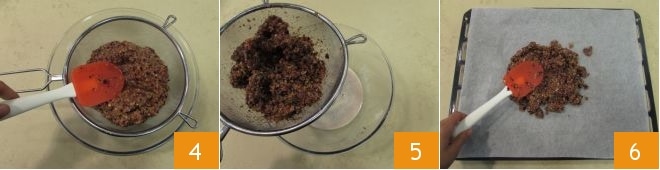 Colocad luego un colador sobre un bol y trasladad la mezcla dentro, presionando con una cuchara 4 para eliminar el exceso de agua 5. Disponed luego sobre una bandeja de horno un papel vegetal y transferid la mezcla de verduras encima 6.
