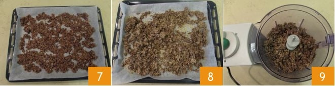 Extendédlo en la bandeja, distribuyéndolo de manera uniforme 10 y cocinad en horno estático precalentado a 120° durante alrededor de 2 horas y media. Cuando las verduras estén bien secas, sacadlas 11, dejadlas enfriar y volved a trasladarlas a la batidora limpia 12.