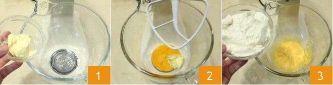 Para preparar los canederli dulces de albaricoques, ablanda la mantequilla y colócala en el recipiente de una batidora equipada con la pala 1 añade las yemas 2 la sal y acciona la máquina hasta que obtengas una mezcla clara, en este punto añade también el queso fresco 3 y sigue batiendo la mezcla,