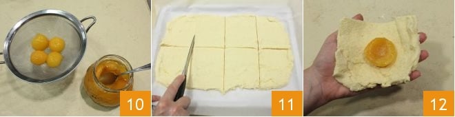 Escurre los albaricoques de su almíbar 10. Si utilizas albaricoques secos deberás rehidratarlos en agua tibia, luego escúrrelos suavemente y si tienen hueso, elimínalo. Si es temporada, puedes utilizar albaricoques frescos siempre que sean pequeños. Cuando la masa esté fría y manejable, divídela cortándola en 8 cuadrados del mismo tamaño 11, toma cada porción y coloca en el centro medio albaricoque 12