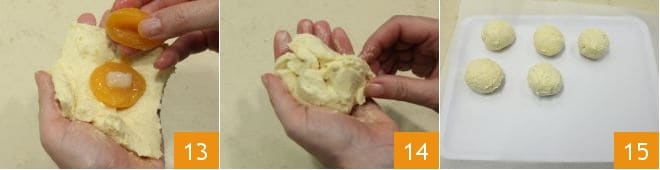 rellena el centro con media terrón de azúcar y cierra con la otra mitad del albaricoque 13. Envuelve la masa alrededor del albaricoque 14 formando una bola y sella bien el contenido, continúa así con el resto de los ingredientes hasta formar 8, que colocarás sobre una hoja de papel de horno 15, cubrirás con film y pondrás en el frigorífico durante media hora.