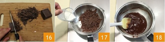 Mientras tanto, puedes preparar la salsa de chocolate de acompañamiento, pica el chocolate negro 16 y ponlo a derretir en un cazo al baño maría (o en el microondas); cuando esté derretido, añade la nata caliente 17 y mezcla hasta obtener una crema densa 18 que reservarás.