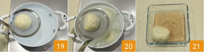 Cuando los canederli estén bien fríos y compactos, cuécelos (4 a la vez) hirviéndolos durante unos 10 minutos en agua hirviendo salada 19, luego escúrrelos 20, pásalos por una mezcla de pan rallado, azúcar moreno y polvo de canela 21.