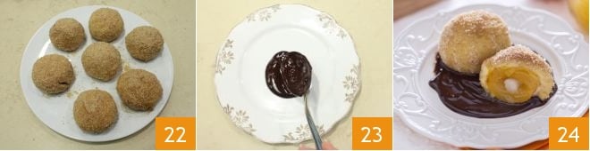 Coloca los canederli empanados en un plato de servir 22. En un plato de postre distribuye la salsa de chocolate en el fondo 23 y coloca encima los canederli dulces de albaricoques cocidos, aderezados al gusto con mantequilla derretida 24.