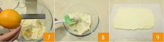 añade también la ralladura de la naranja 7, mezcla la masa con una espátula 8, luego extiende la masa sobre una hoja de papel de horno dándole dimensiones de aproximadamente 20 x 40 cm 9, cubre con otra hoja de papel de horno y pon en el frigorífico a reposar durante aproximadamente 1 hora sobre una bandeja.