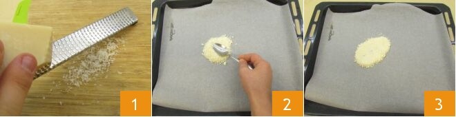 Para realizar los cannoli de Grana rellenos, primero ralla el Grana Padano con un rallador de malla fina 1, toma una bandeja de horno, coloca encima una hoja de papel de horno y distribuye 15 g de Grana 2 y extiéndelo con el dorso de una cuchara en un disco ovalado de unos 10 cm 3.