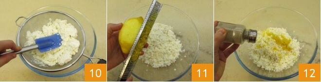 Ahora ocúpate del relleno: tamiza la ricotta a través de un colador 10, aromatízala con la ralladura de limón 11 y sazona con sal, pimienta 12,