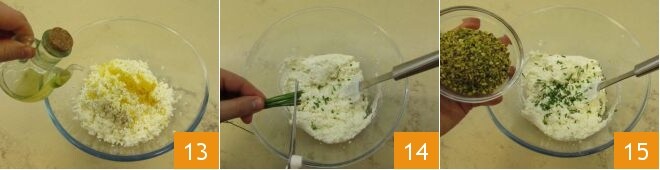 aceite de oliva 13, la cebolleta cortada en trozos pequeños 14 y finalmente añade también el granillo de pistacho 15, mezcla la crema para amalgamarla.
