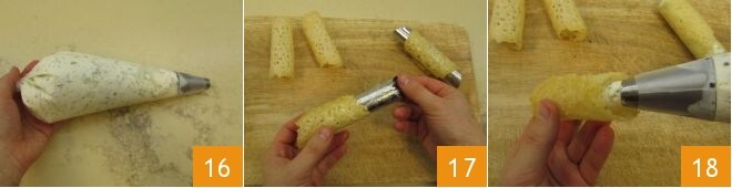 Transfiere la crema de ricotta a una manga pastelera con boquilla lisa 16. Toma los cannoli y retira delicadamente el cilindro 17, luego rellénalos exprimiendo la crema de ricotta desde un extremo 18 y del otro.