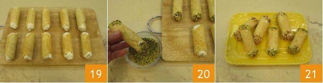 Continúa de esta manera hasta realizar 10 cannoli de Grana 19. Para concluir, decora los dos extremos con el granillo de pistacho 20 y de avellanas. Los cannoli de Grana rellenos están listos para ser disfrutados 21.