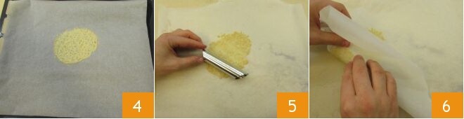 Cuece la cialda de Grana, una a la vez, en horno estático precalentado a 200° durante unos 5-7 minutos, hasta que el queso esté dorado. Una vez cocida, saca la cialda del horno 4, transfiere el papel de horno a una superficie de trabajo y coloca encima un cilindro para cannoli 5, después enróllala aún caliente doblando el papel de horno para ayudarte a despegar la cialda al principio 6.