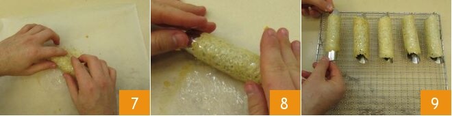 Enrosca toda la cialda alrededor del molde 7 para crear los clásicos cannoli 8, presionando suavemente para sellar los dos extremos. Luego colócalos en una rejilla 9 y déjalos enfriar.