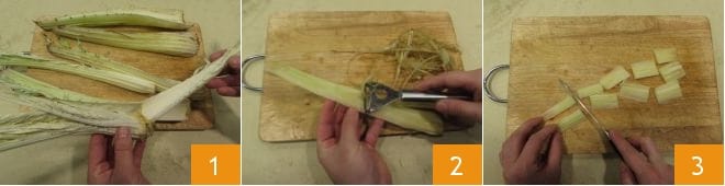Para preparar el cardone beneventano, comience con la preparación del Caldo de gallina (o pollo). Mientras tanto, dedíquese a la limpieza del cardo (variedad gobbo): elimine las costillas más externas y correosas 1 conservando las internas, que son tiernas. Lávelas cuidadosamente y de estas elimine los filamentos con la ayuda de un pelador 2. Corte las costillas en pedazos 3