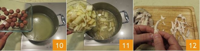 Después de escurrir el pollo, cocine las albóndigas en la cacerola con el caldo de pollo durante unos 10 minutos 10, luego agregue los cardos bien escurridos y cocine por otros 15-20 minutos 11. Mientras las albóndigas y el cardo se cocinan en el caldo, desmenuce el pollo con las manos, reduciéndolo a tiritas pequeñas 12.