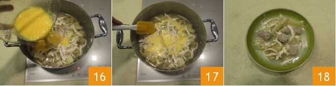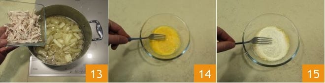Incorpórelas también en el caldo 13. Finalmente, rompa los huevos en un recipiente 14 y mezcle con una pizca de sal y el queso parmesano rallado 15.